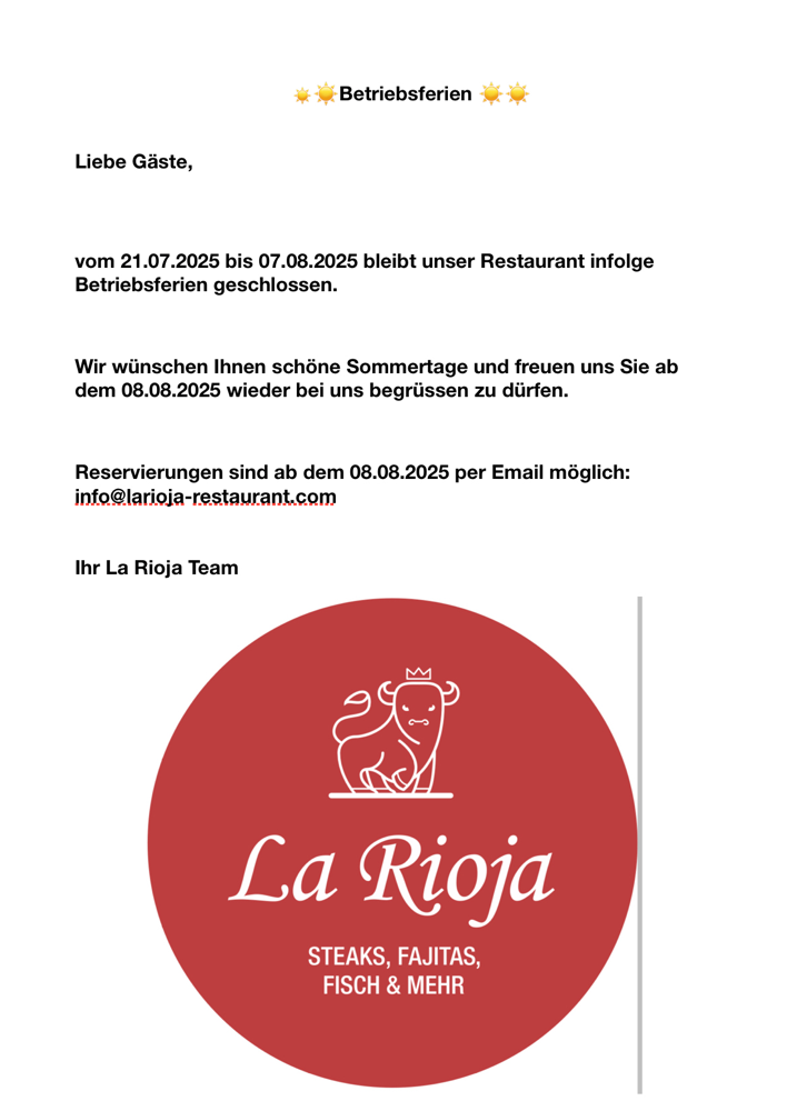 Sollte Ihnen eventuell etwas dazwischen kommen oder sich die Personenanzahl verändern, dann wären wir Ihnen sehr dankbar, wenn Sie uns zeitnah informieren könnten. Bis bald. Ihr La Rioja Team.